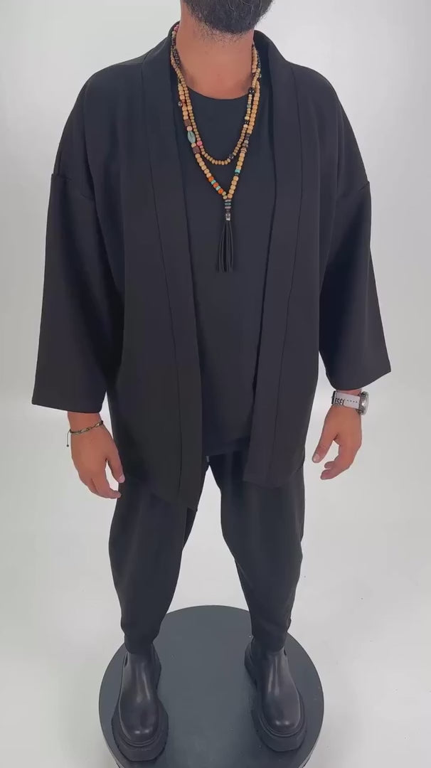 Nxx39 – Minimalista fekete együttes kardigánnal és nadrággal.